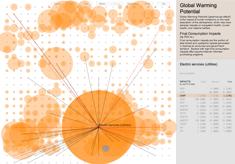 Where it gets really nutty and insanely complex is that you can then map the "flows" for each sector — for example, you can see the way electrical generation draws on resources from all sorts of other industries. The map of those flows amount to kind of carbon footprint for each industry: