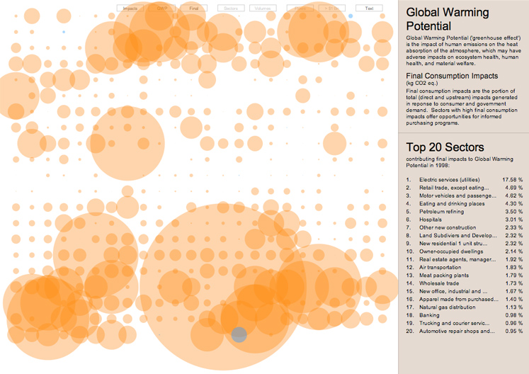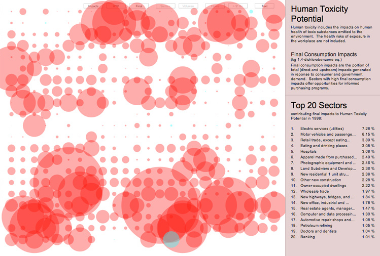 Granted, the actual map is a bit buggy and way too complex (in fact, the only way to really browse the thing is to download the app, and play with it on your desktop). But we've got a summary here of how it works. First, the map presents every sector of our economy as a dot on a grid. Then, it allows you to cycle through a series of environmental impacts, ranging from ozone depletion to toxic byproducts to global warming impacts. The bigger the bubble around each industry, the larger its impacts: